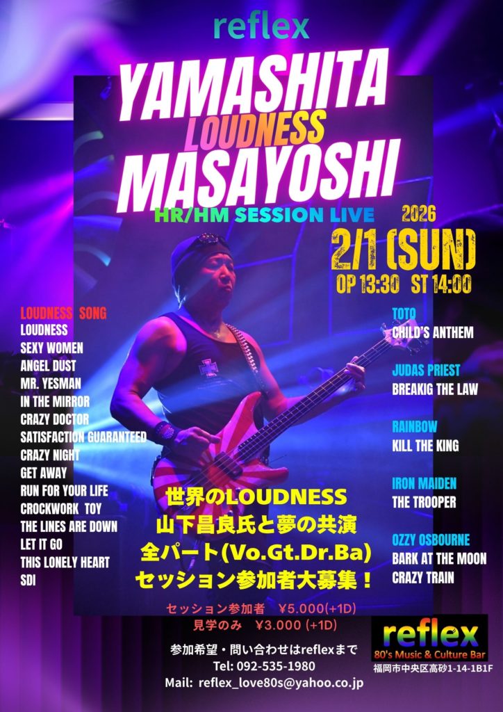 世界のラウドネス、山下昌良氏と夢の共演セッションライヴ開催! ラウドネスの名曲、洋楽名曲に山下昌良氏全曲参加 Vo.Gt.Ba.Dr.全パート、参加者募集中!(ベースはツインベース)